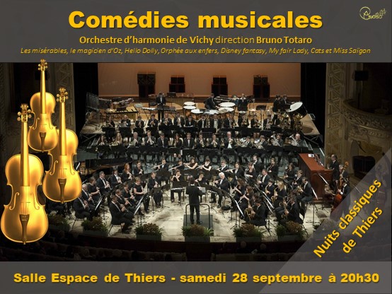 Pour clôturer notre festival, nous accueillerons l’Orchestre d’harmonie de Vichy dans un programme de comédies musicales. L’orchestre d’harmonie est dirigé par Bruno Totaro. Il est composé de 75 musiciens semi-professionnels. Il effectue une vingtaine de concerts par an en France et en Europe. Au programme, des extraits de comédies musicales pour tous les âges et tous les goûts : Les misérables, le magicien d’Oz, Hello Dolly, Orphée aux enfers, Disney fantasy, My fair Lady, Cats et Miss Saïgon