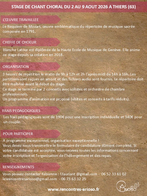 Le stage « Requiem de Mozart » réunira 80 chanteurs amateurs confirmés, en un seul chœur mixte, pour une semaine de travail intensif encadrée par Blanche Latour, couronnée par deux concerts publics avec orchestre et solistes.